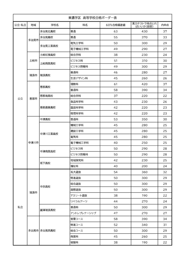東濃学区 高校合格ボーダー表(参考にして下さい)
